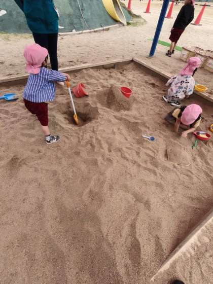 砂や土にたくさん触れています。チャーハンに見立てておいしそうなランチを作ったり、いろんなものが隠れるくらいの大きな山と穴を作ったり、虫をひたすら探したりしています。