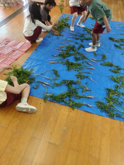 きりん組さんが育てたにんじんをみんなで収穫しました。きりん組さんがうさぎ組さんにとり方を教えてくれました。たくさんのにんじんが取れて教室いっぱいになりました。