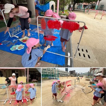 この前、室内でゆび絵具遊びを楽しんだ4歳児。今日はテラスのアクリルボードに絵や模様をかいて遊びました!感触を楽しんだり、指で塗り広げたり、ペタペタと全身を使って遊ぶことを楽しみました♪