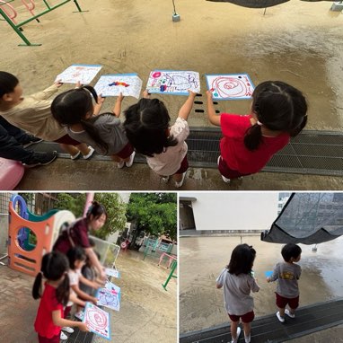 水性ペンでかいた絵や模様に、ポタポタと雨粒を落とすと、だんだんかいた絵が変身してきました。「わ!ボワってなってきた!」「色混ざった〜」と驚きの声があがります。にじみ絵の出来上がりです☆