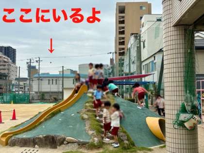 2匹一緒にひらひらと飛んだり、子どもたちの近くにやってきたりと、楽しそうに飛ぶ様子が見られました。「おかえり!」「帰って来てくれて、ありがとう〜」「また、あそぼうね」と子どもたちは、築山の上からちょうちょたちに声をかけました。