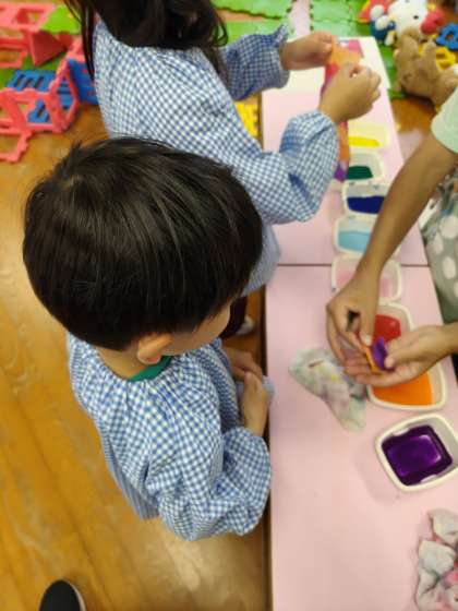 色で遊ぶ 公開日 2025/06/10 更新日 2025/06/10 きょうのようちえん 絵の具やペンを使って色をつけています。いろんな色を使っていろんな見え方を楽しんでいます。外は雨ですがお部屋の中はとてもカラフルです。 いいね(0)