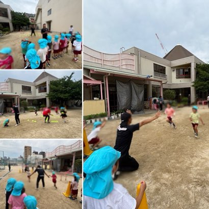 5歳児は『投げる』遊びを楽しんだあと、宝物集めをしました。ルールを少しずつ増やしながら、友達や先生と一緒に黄色の宝物を取りに行きます。途中にいるアンディーコーチに捕まらないように、作戦を考えながら宝物集めをがんばりました!