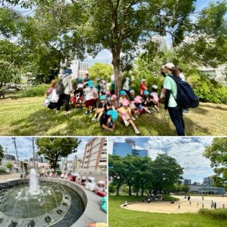 扇町公園の小さな森(子どもたちが命名)やまんまる広場、お隣の噴水など、暑さを忘れて楽しみました♪お茶休憩もたくさんしたので、水筒がどんどん空っぽに!先生たちにペットボトルのお水を補充してもらって、ひと安心の子どもたちでした(*^_^*)