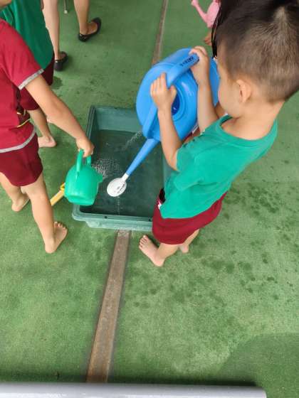 強い雨が降った朝の活動の一コマです。雨に負けず?みんなで水を集めて水を集めて水遊びをしています。元気に遊んでいます!