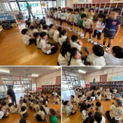5歳児と1年4組の友達が、幼稚園で顔合わせをしました。初めましての友達や仲良しの友達、4組の先生、そして5歳児の先生、みんなでむしむしジャンケンを楽しみました(^-^)