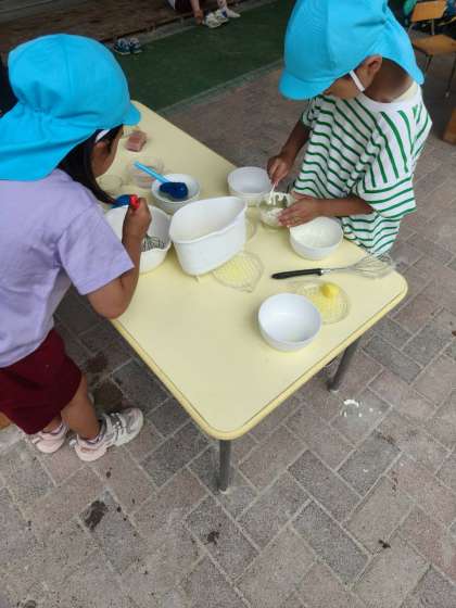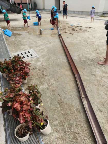 子どもたちは園庭で水遊びをめいっぱい楽しんでいます。