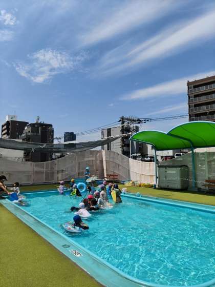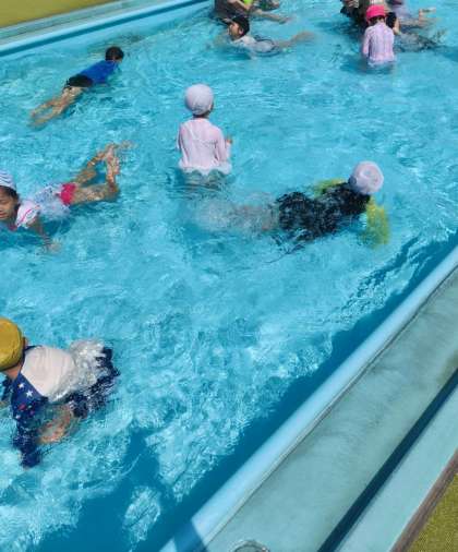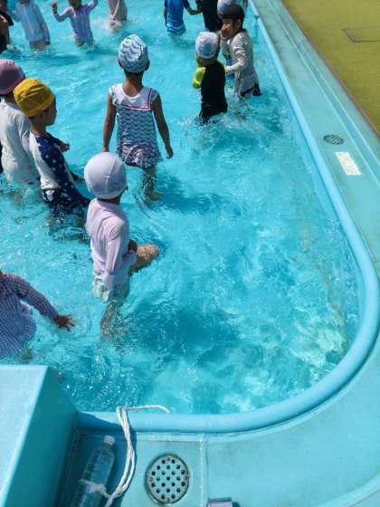 今日もプールで気持ちよく遊んでいます。遊びながら水の流れや浮力などを体で感じています。