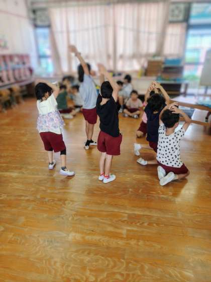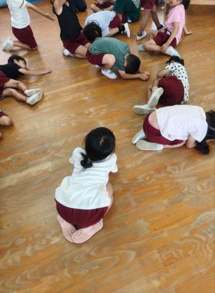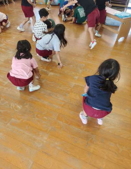 きりん組さんがいろんな生き物になりきっていました。ダンゴムシやカエル、クワガタなどなど…全身でなりきっていました。