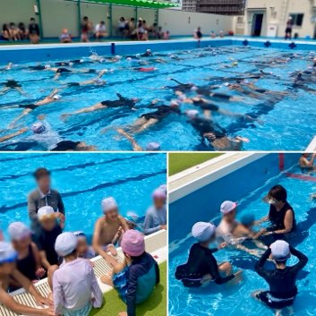 6年生がプカプカと浮くすご技を見せてくれました!そして、幼稚園の子どもたちが怖がらないように、「ゆっくりでいいよ」「大丈夫、ちゃんと足持ってあげるからね!」「お兄ちゃんの肩持って入ってな、離したらあかんよ」と一言一言やさしく声をかけながら、入水させてくれました。
