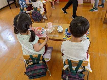 うさぎ組は、初めてのお弁当でした。先生の話を聞きながら、順番に机の上に用意をしていきました。「みんなで食べるお弁当嬉しい!」「おいしいね」と喜んで食べていました。