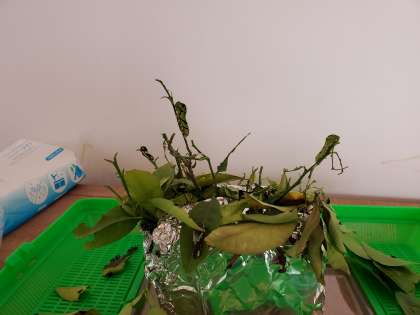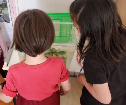 よく見ると、「幼虫があおむしになってる〜」「たくさんいてる」と子どもたち。