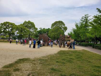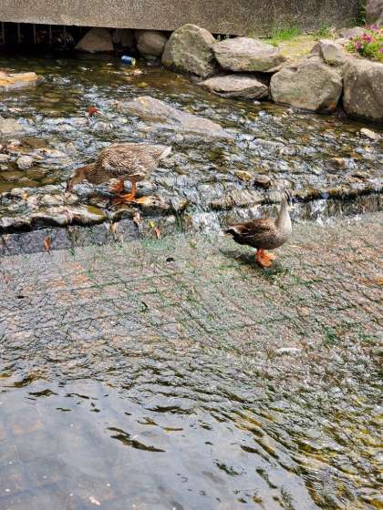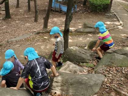 おべんとうのあとはおやつを食べて公園を散策したり、アスレチックで遊んだり、汗だくになりながら楽しむ姿が見られました。カモも暑いので水浴びをしていましたよ。