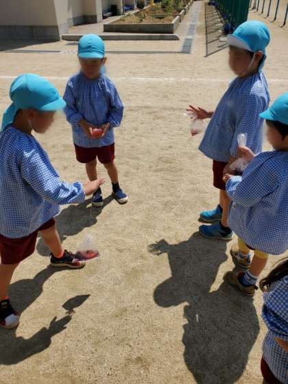 お花の色水をつくりました。友達がしている姿を見ると、「どうやってつくるん?」「お花とお水を一緒にいれるんだよ」と、自分の知っていることを教えてあげる姿が見られました。