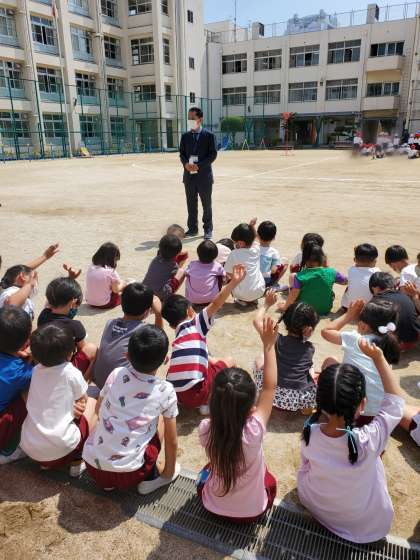 避難訓練の合言葉「お は し も」の約束をしました。「おさない はしらない しゃべらない もどらない」ですが、なぜおしたり、はしったりしてはいけないのかも知らせました。次回は、うさぎ組も一緒に避難訓練に参加します。