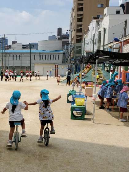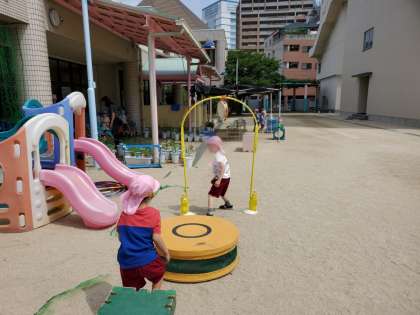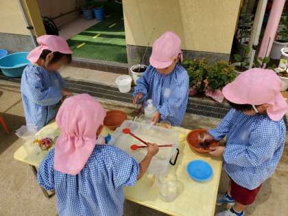 今日は午前保育でしたが、子どもたちは園庭で様々な遊びを楽しんでいました。おにごっこ、砂場、一輪車、トランポリンなど自分のした遊びを降園前に嬉しそうに話してくれました。年長児の姿を見て、真似をしながら色水遊びをする年少児もいました。