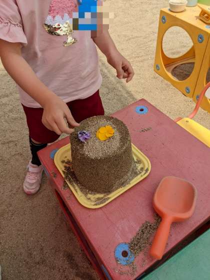 砂に水を混ぜて、ケーキ作りにチャレンジ。何度か崩れましたが、「もっと水を混ぜないと無理やわ!」と友達と話しながら、成功したケーキ!