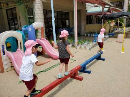 平均台の遊び 公開日 2022/05/27 更新日 2022/05/27 きょうのようちえん 園庭に平均台を置いておくと、外にでてきた子どもたちが「何だろう?」と興味をもち遊び始めました。少しこわがっている子どもには教師が手をそえると安心して平均台の上を歩いていました。 前に友達がいると、少し間をあけながら歩いたり、落ちないように歩き方を考えたりする姿が見られました。 いいね(0)