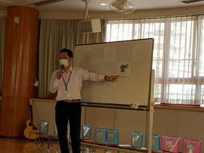 ドラえもんやカバの絵を描いてくれたり、絵を用意してくださり、うさぎに見えたり、鳥に見えたり、人によって見え方が違うねと話をしてもらいました。ギターの弾き語りもありました。