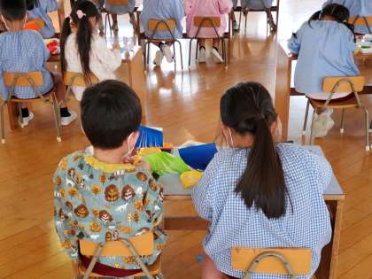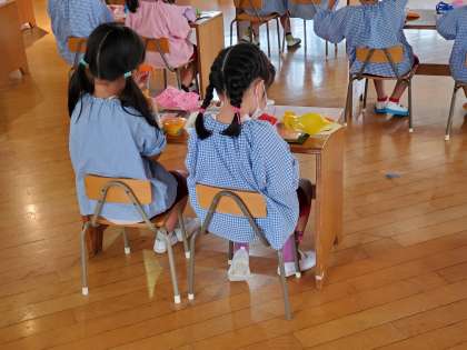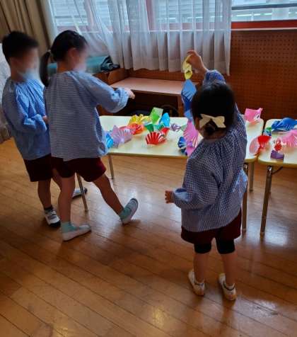 子どもたちは折り紙を慎重に切ったり、のりで丁寧に貼ったりしながら、形ができることや長くなっていくことを楽しんで貝つなぎの製作をしていました。折り紙の大きさや色も自分で好きなものを選んでいました。何個つながっているか数を数えている子どももいました。