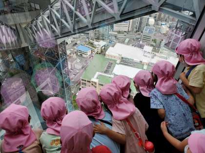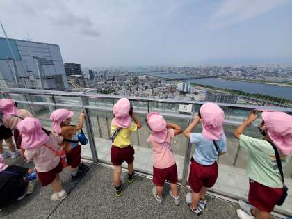 空中庭園にも行きました。「阪急電車だよ」「JR環状線の電車が走ってる」「おっきい川がある」「車がトミカみたいに見えるなぁ」「飛行機が飛んでいる」と、景色を楽しんで見ていました。小さくですが、幼稚園の砂場の屋根も見ることができました!