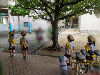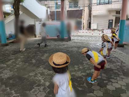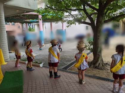 6月9日〜始まったあいさつ隊。年長児がグループごとに交代で朝、門に立ってあいさつをしました。始めはドキドキしながら、あいさつをしていましたが、「おはようございます」と1回言うと、自信が出てくるようで、2回目からは大きな声であいさつをしていました。友達や保護者から「おはようございます」とあいさつされると嬉しそうにしていました。今日が1学期のあいさつ隊最終日でしたが、明日からあいさつ隊がいなくても大きな声であいさつしてくれるのを楽しみにしてます。