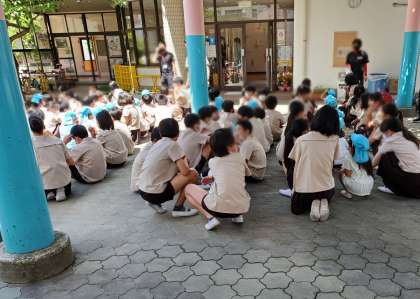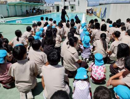 6年生との顔合わせ 公開日 2022/06/28 更新日 2022/06/28 きょうのようちえん 7月4日に6年生とプール交流があるので、今日はペアになるお兄さん、お姉さんと顔合わせをして、小学校のプールに案内をしてもらいました。幼稚園のプールよりもとても大きいですが、「大丈夫だよ」「溺れた時は助けてあげるからね」「プールのお水少なくなるからね」と、屋上のプールに着くまでの会話も楽しんでいました。お天気になって元気に入れることを願っています。 いいね(0)