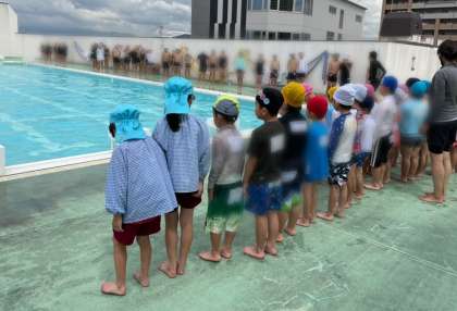 今日は、きりん組(年長組)が小学校のプールに入れてもらい、6年生とプール交流をしました。行く前から楽しみ、ドキドキ、緊張、不安など様々な子どもの姿が見られましたが、6年生のお兄さん、お姉さんが優しくしてくれて安心したようでした。プールの中でおんぶをしてもらったり、お魚みたいに泳がせてもらったりしました。たからさがしでは、たからものをいっぱいひろってくれました。