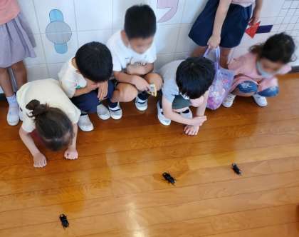 預かり保育の子どもたちが見ると「クワガタや」「かむんかなぁ」「こっちに近づいてきたぁ〜」と言いながら興味津々に見ていました!
