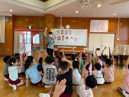 「いつもけがしたところを水で洗ってる!」「鼻血が出たとき、ティッシュで押さえてた!」など幼稚園でけがをした時のことを思い出して、クイズに答える姿が見られました。
