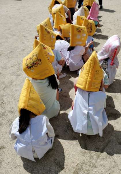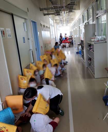一次避難は保育室、二次避難は園庭、三次避難は四階の6年3組の教室前でした。
