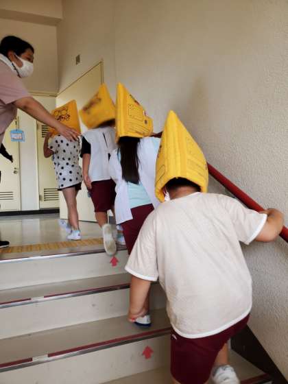 外は暑かったですが、教頭先生のお話を聞き、自分の体を守るため四階まで頑張ってあがることができました。いつもと違った避難訓練でしたが、地震や津波の時にどうするのか。ということが経験できてよかったです。