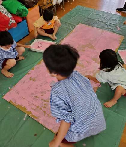 絵の具で色ぬり 公開日 2022/09/16 更新日 2022/09/16 きょうのようちえん うさぎ組の子どもたちはピンク色の絵の具を、ローラーを使って段ボールに一生懸命にぬっています!さぁ、これはいったい何になるのでしょうね…? いいね(0)