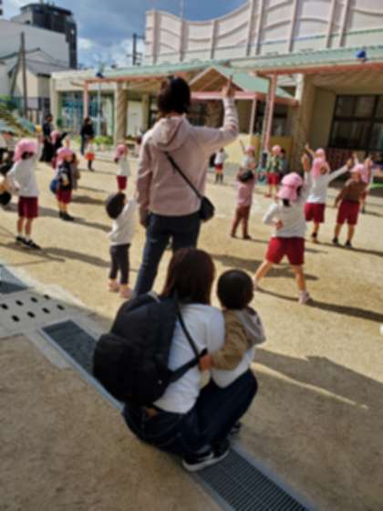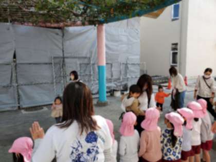 今日はうさぎ組と「元気いちばんばん」の体操をして遊びました。「またきてねぇ〜」「バイバイ〜」とお見送りをしました。
