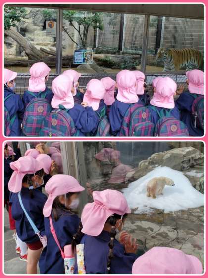 「しろくまが雪で遊んでるよ」「ぞうがごはん食べてるね。おなかすいてきたぁ〜」「きりんの親子かなぁ。赤ちゃんかわいいね」「ぺんぎんさん、泳ぐのじょうずだね」などと、動物の姿を見ながらつぶやいたり、友達と楽しく会話をしたりしていました。