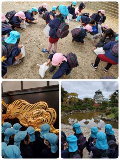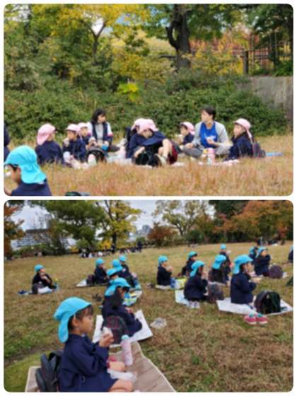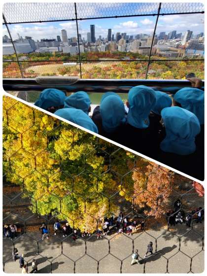 歩いているときに大阪城が見えてくると「うわぁ」「大阪城だ!」と、とても興奮していました。お城の一番上にのぼったきりん組が、下で遊んでいるうさぎ組を見つけて、嬉しそうに「お〜い」と手を振っていました!