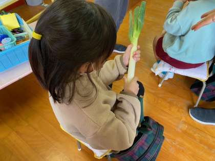 何種類か用意した冬野菜や果物に触れ、長ネギのにおいを嗅いでみたり、りんごとキウイフルーツの感触の違いを感じてみたりしました♪