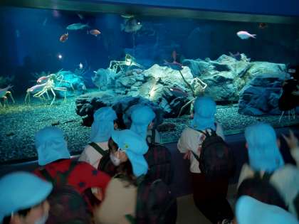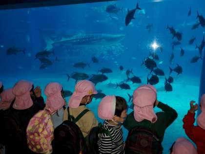 海遊館に入ったところにあるトンネルに魚が泳いでいるのを見て大興奮!ジンベイザメも近くにきてくれて「すご〜い」「おっきいなぁ」と喜んでいました。タカアシガニの真似をしている姿もありました。