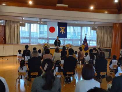 今日は入園式でした。ピカピカの制服をきて元気に新入園児が登園してきてくれました。