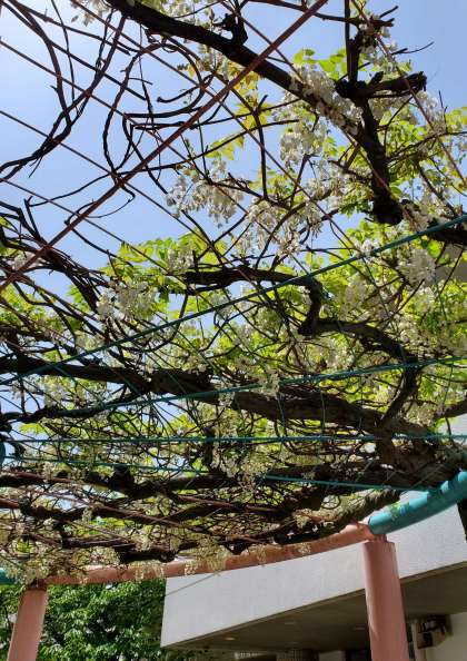 藤の花 公開日 2023/04/20 更新日 2023/04/20 きょうのようちえん 通用門を入った所に藤の花がきれいに咲いています。白色の花です。立ち止まって上を見上げて見てくださいね(^_^) いいね(0)