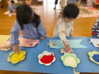 【うさぎ組】指絵の具遊び 公開日 2023/04/25 更新日 2023/04/25 きょうのようちえん 今日は、指絵の具で自分のこいのぼりに模様をつけました。 いろいろな色に興味をもち、「絵の具冷たい」「さらさらだね」と絵の具の感触を味わいながら楽しむ姿が見られました。 天気がいい日に、自分のこいのぼりを外で泳がせて遊びたいと思います。 いいね(0)