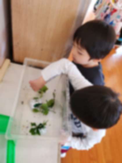 幼虫のお世話 公開日 2023/05/09 更新日 2023/05/09 きょうのようちえん クラスで飼っている幼虫に、ミカンの葉をあげました。葉を匂ってみて!と声をかけると「ミカンの匂いがする」と実感していました。その後も幼虫を観察しながら「葉っぱいっぱい食べてるね」「動いているのかわいい」と、話をしていました。 いいね(0)