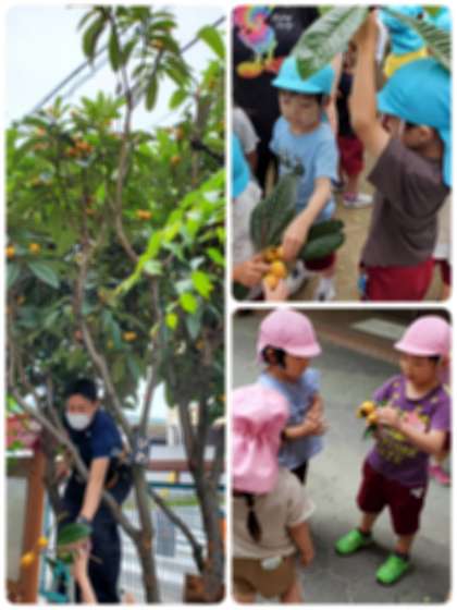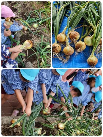 玉ねぎ・びわの収穫 公開日 2023/06/01 更新日 2023/06/01 きょうのようちえん 今日は収穫祭でした。午前中は玉ねぎ、午後からびわを収穫しました。 玉ねぎは1人1個ずつ収穫でき、匂いを感じたり、根の長さに驚いたりしていました。 びわは高い木の上にたくさん実っていたので、事業担当主事さんが取ってくれました。取ってもらったびわを嬉しそうに眺めながら、葉の裏表の違いに気づく姿もありました。 次は何の野菜が収穫できるのか楽しみですね! いいね(0)