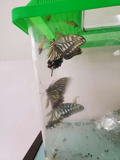 アゲハチョウ 公開日 2023/06/05 更新日 2023/06/05 きょうのようちえん 今日の朝、飼育ケースをのぞいてみるとアゲハチョウが三匹産まれていました。いもの苗植えから帰ってくるともう1匹産まれていました。せまいところにずっといるのも…ということで、みんなで外にとんでいくのを見送りました。「バイバイ、元気でね」「また遊びにきてねぇ」の言葉を聞きながら、大空にとんでいきました。またどこかで会えるといいね! いいね(0)