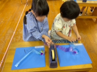 【うさぎ組】製作あそび(吹き流し) 公開日 2023/06/26 更新日 2023/06/26 きょうのようちえん 先日、スカイビルへ園外散歩に出かけ、大きな吹き流しの七夕の飾りを見たので、七夕の製作遊びで自分の吹き流しをつくることにしました。 初めてセロハンテープを使った製作をしましたが、約束を守って怪我なく楽しんでつくることができました。 色とりどりのカラフルな吹き流しを笹に飾るのがとても楽しみです! いいね(0)