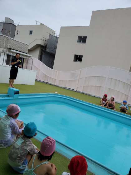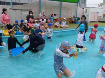 その後、各クラスに分かれて、プールの中をお散歩したり、浮き輪や水鉄砲を使って遊んだりしました。「水が気持ちいい!」「今日のプール楽しかった!」という子どもの声が聞かれました。