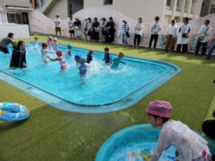 今日はきりん組のプール参観でした。きりん組の子どもたちはお家の人に水かけごっこやビート板を使ってスーパーマンの泳ぎなどを見てもらい嬉しそうでした!