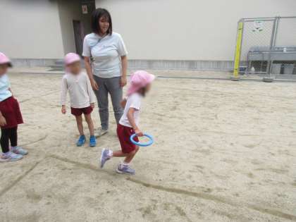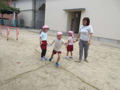 年長児の真似をしてリレー遊びをしている子どもたちがいました!