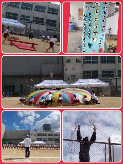 きりん組は、忍者になってチャレンジやパラバルーンの修行を頑張りました。その姿を小学校の屋上から忍者が見てくれていました。リレーも一生懸命に走りました!