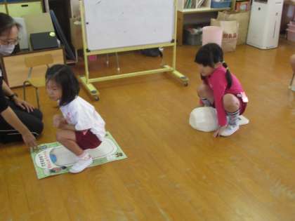 「園外保育の時」や「きりん組になった時に、新しいうさぎ組のお友達に洋式トイレを譲れるようになったら素敵だね。今から和式トイレの練習をしてみようね。」という話をしました。